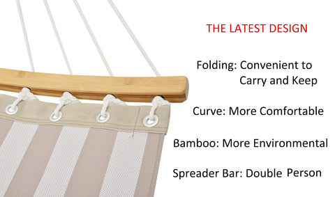This is the latest design hammock that the bamboo spreader bar is folding and curved. Folding design make the hammock portable and easy assemble. Curved design make the hammock more comfortable and safe than normal hammock. Bamboo spreader bar is more strong, more durable, more natural and more environmental than others’ wood spreader bar.